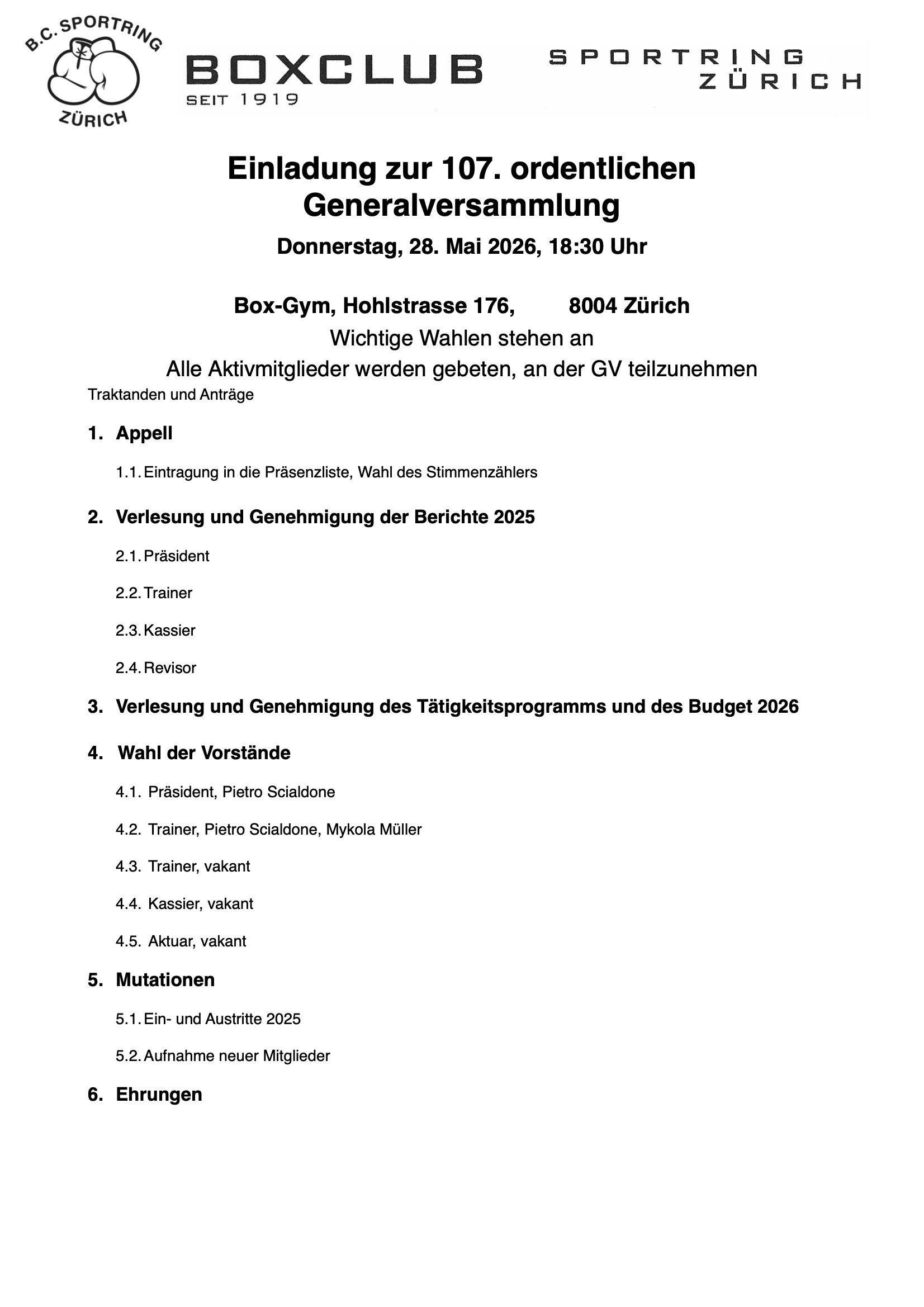 Gerne laden wir alle Mitglieder des Boxclub Sportring Zürich ein, am 23. April 2025 um 19.30 Uhr an der Generalversammlung teilzunehmen.
